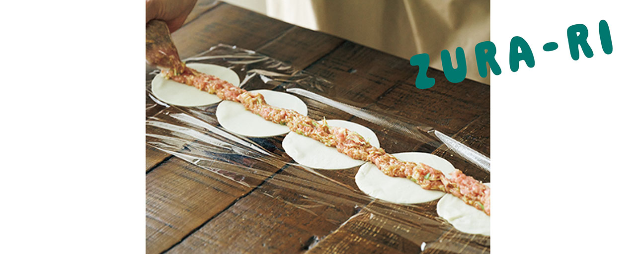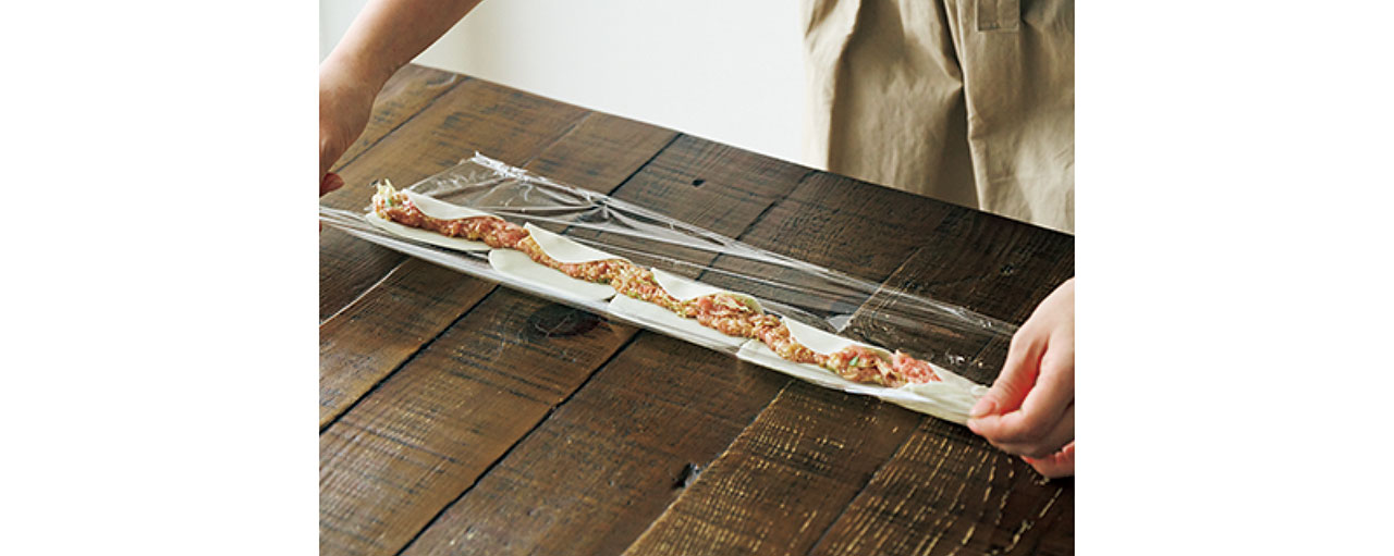 - ラップを長さ50㎝ほど広げ、餃子の皮を重ならないように5枚並べる。皮の真ん中に、端から端まで①の肉ダネの半量を絞る。ラップの手前を持ち、手前の皮を肉にのせるように折りたたむ。肉の上にのった皮に水をつける。ラップの奥を持ち、手前に折りたたんで肉ダネを包む。