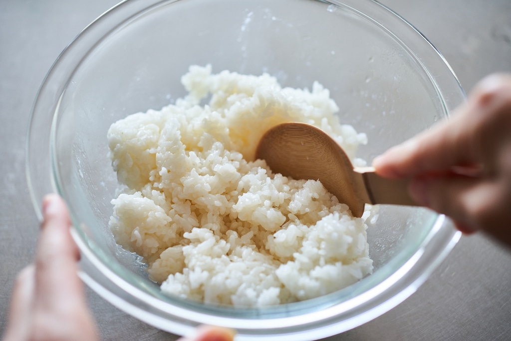 - (B)を混ぜる。ボウルにごはん、(B)を入れ混ぜ合わせる。