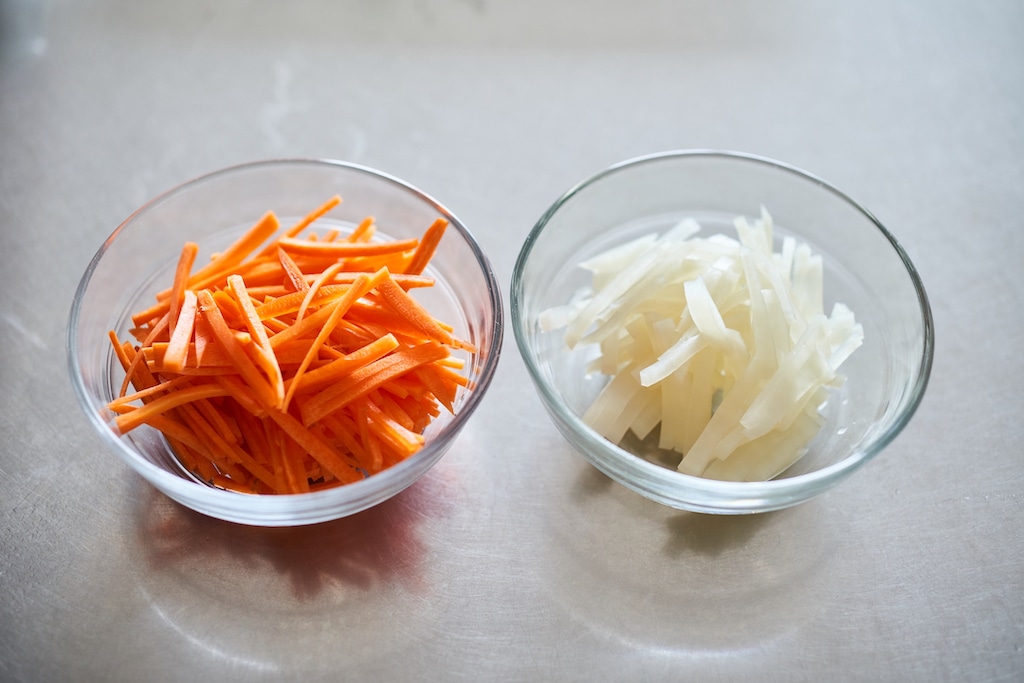 - にんじん、たくあんは細切りにする。