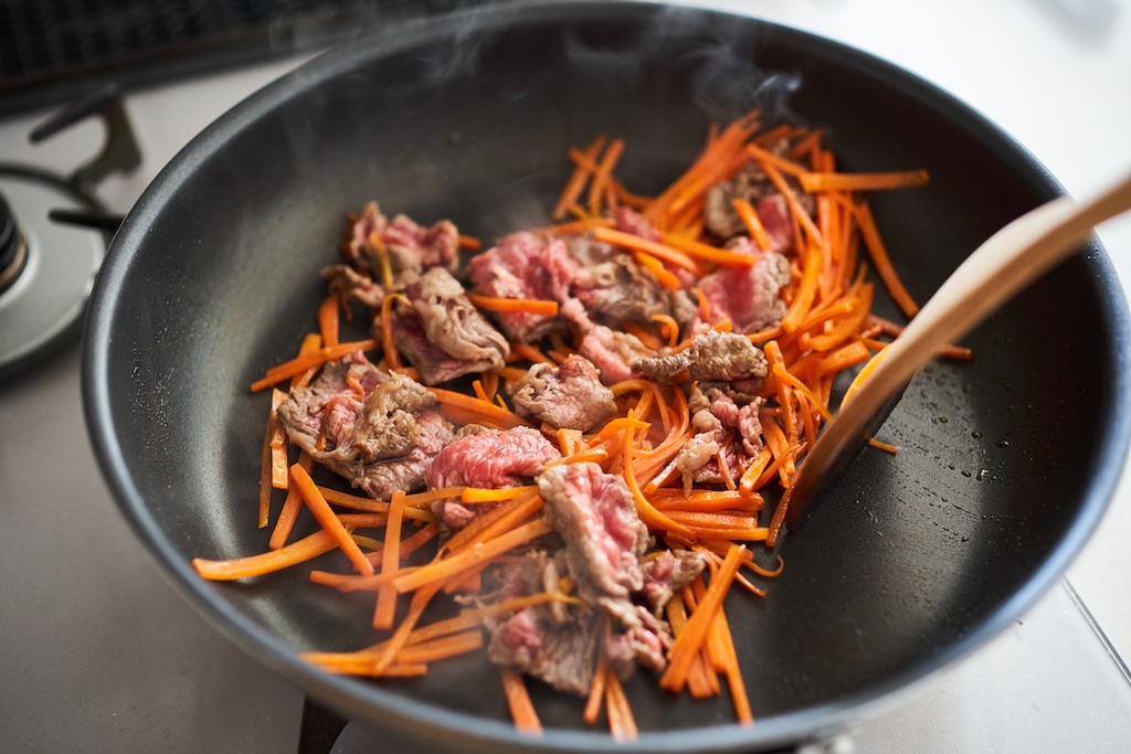 - フライパンにごま油を中火で熱し、にんじんを入れ炒める。しんなりしたら牛肉を加えて色が変わったら(A)を加え炒め煮にする。水分がなくなったら取り出しておく。