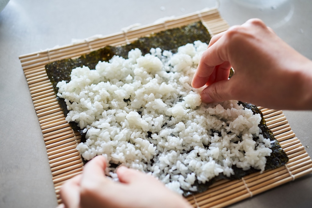 - 巻きすに、光沢がある方を下にして焼き海苔をのせる。海苔の奥側2cm を残し、手を水で濡らしながら3のごはん半量を薄く広げる。