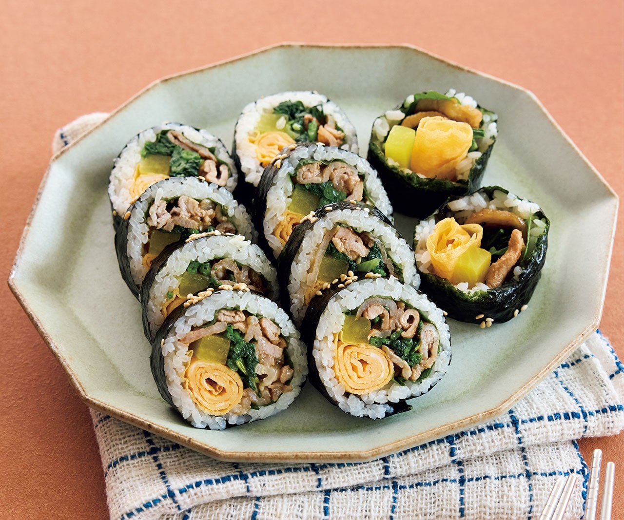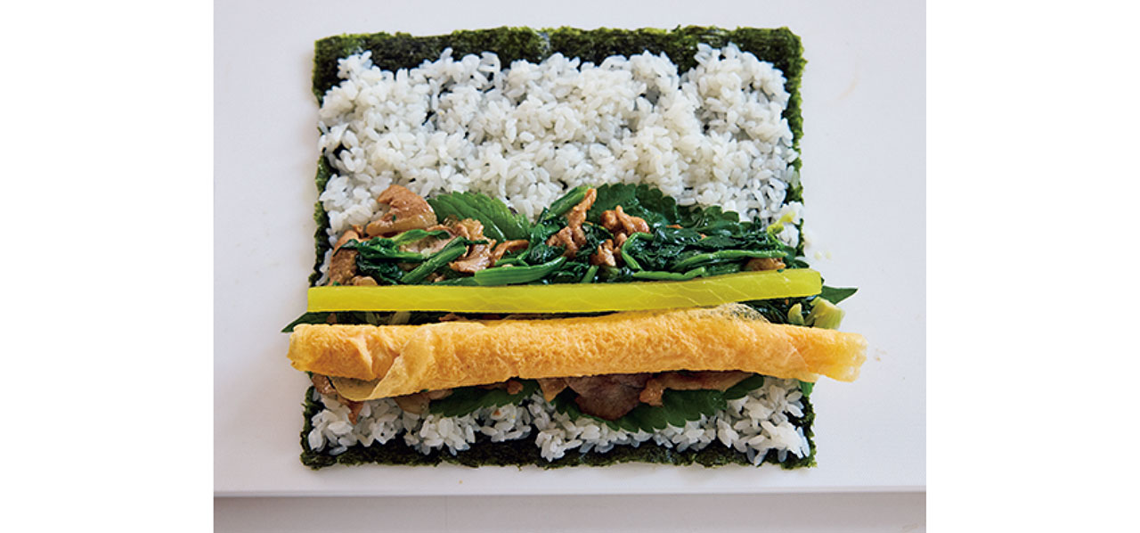 「甘辛く焼いた豚肉をたっぷり入れた、満足感いっぱいの韓国風ノリ巻き。肉も野菜も炭水化物も入っているから、パクッとひと口で栄養補給は完璧!」(重信初江さん)